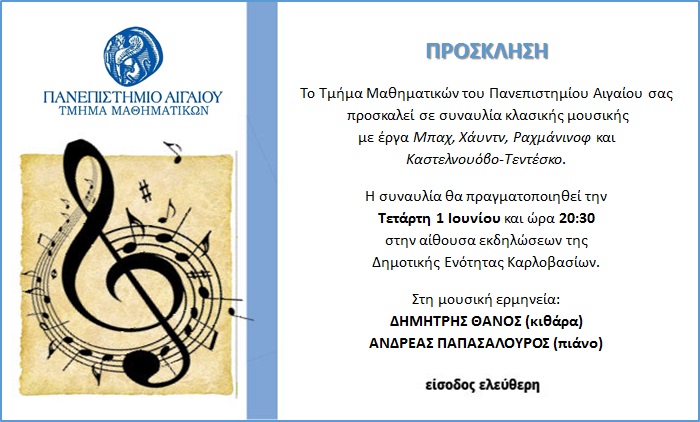 Το Τμήμα Μαθηματικών του Πανεπιστημίου Αιγαίου σας προσκαλεί σε συναυλία